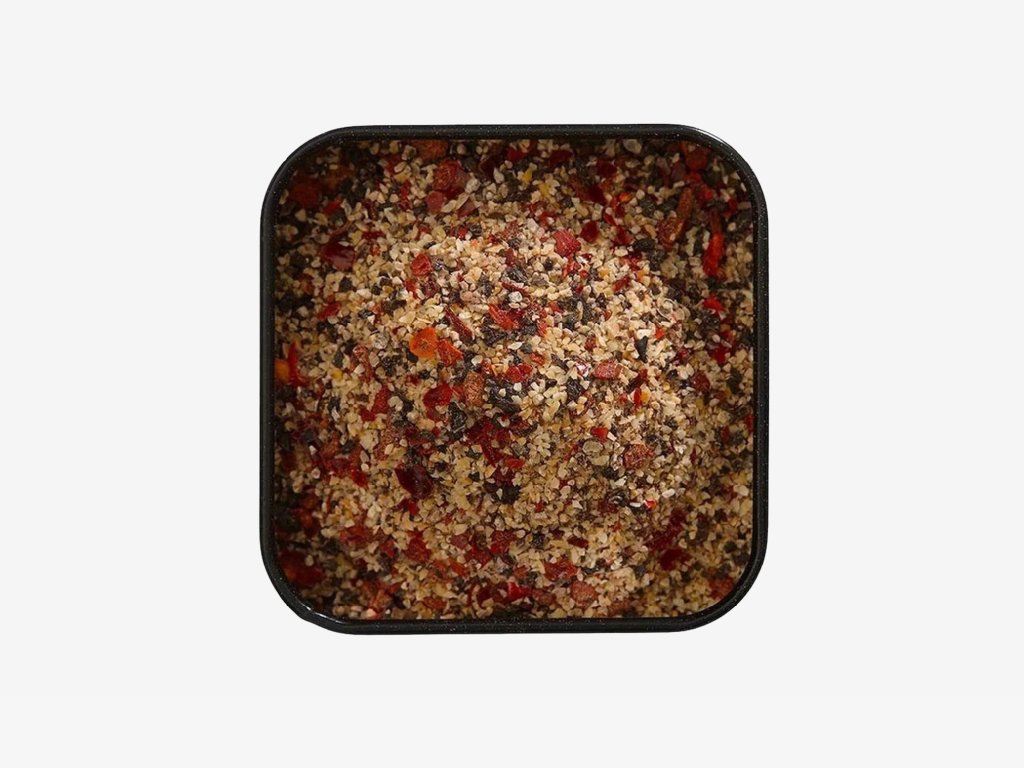 Složení: černý pepř*, česnekový granulát*, chilli*, černý česnekový granulát (* = organické)